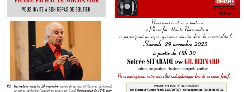 REPAS DE SOUTIEN PHARE FM HAUTE NORMANDIE Samedi 29 novembre 2025 à 18h 30